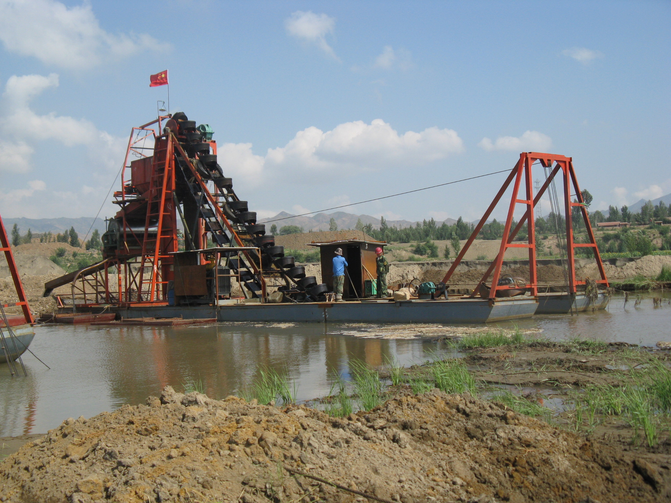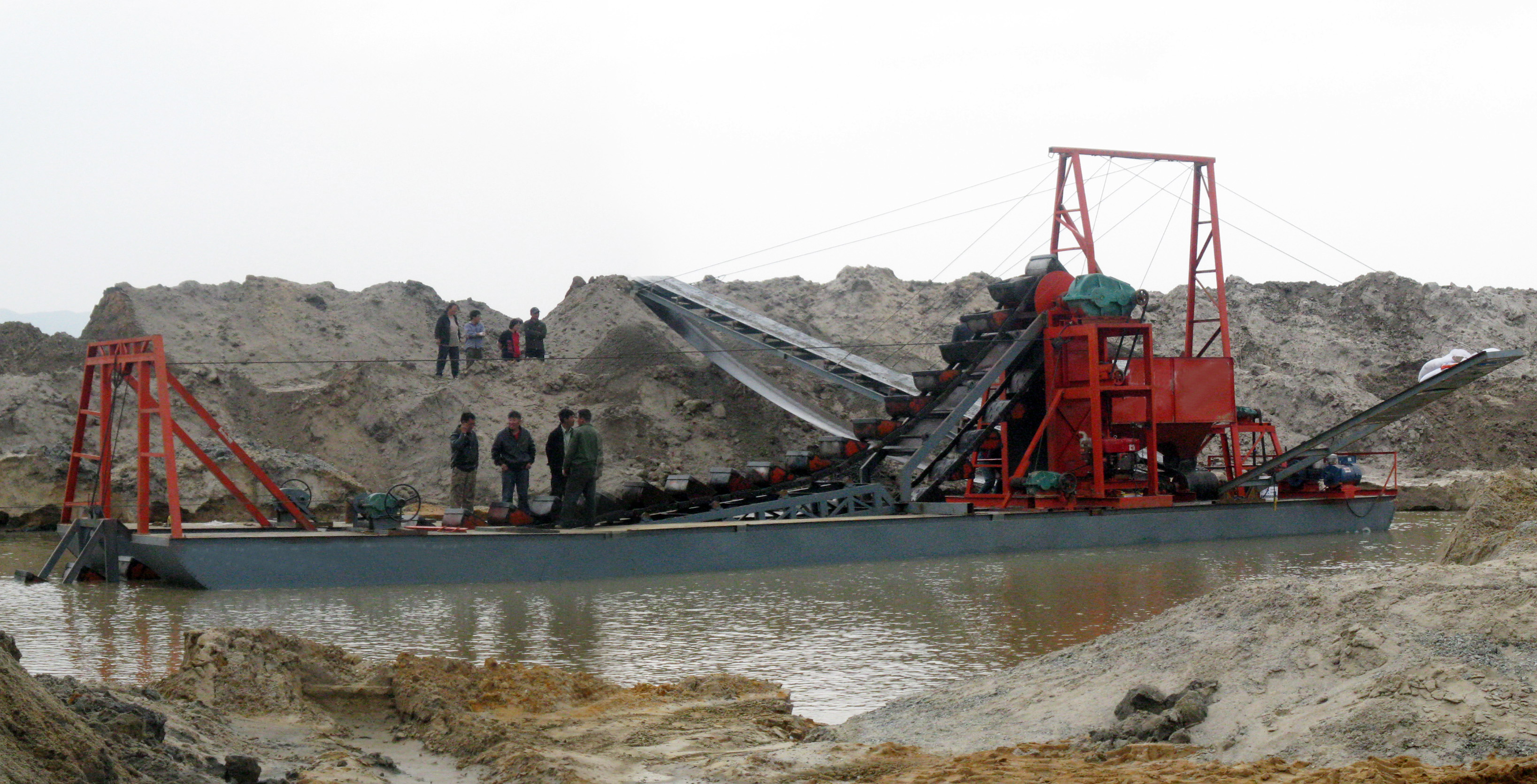 鏈斗式挖沙船是一種利用機械動力對河床底部的泥沙進行提取的挖沙設備,一般情況下多采用流動作業。挖沙船的浮體采用拼裝式箱型結構,挖沙船同時還配有挖掘裝置、篩選裝置、提升裝置、傳送裝置等。挖沙船通過動力裝置驅動挖斗上料,石塊通過篩選傳由輸送帶傳出,沙子由輸送帶傳到指定地點。大型河道挖沙船的機械化和自動化程度極高,一條挖沙船即可成為一個生產單位,可以實行采沙和沙石分離精選全過程。