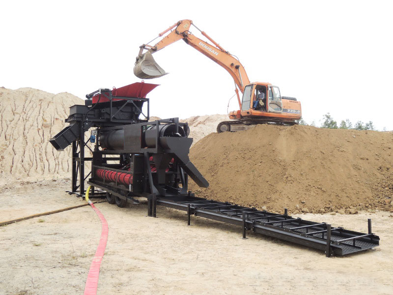 可采用挖掘機、鏟車、輸送機上料、也可定制為沙泵或翻斗車上料的料斗。料斗可配套格篩,將大石塊廢料隔出,以免對篩造成傷害。料斗可配套振動給料機、使礦料在進入滾筒式均勻、不間斷。小型淘金設備