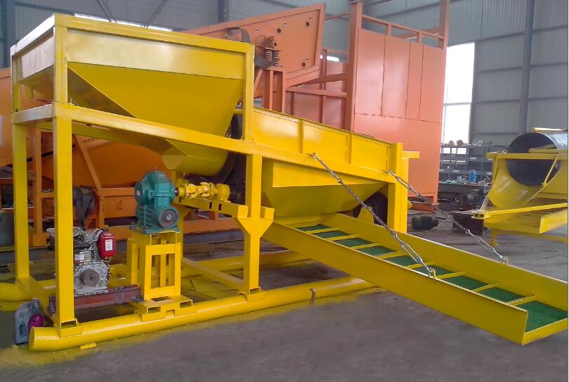 一種小型沙金機(jī)械 小型的沙金機(jī)械有移動(dòng)式的,有滾筒式的,這種在沙金礦開采中移動(dòng)比較方便,篩分、洗礦、黃金回收作用一個(gè)不少,只是產(chǎn)量稍微小了點(diǎn)。可以采用小型的工程機(jī)械來配合給料,采用小型的水泵來供水。這種設(shè)備生產(chǎn)成本低。