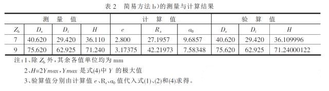 (2)通過上述兩種簡易測量方法而計算求得的擺線輪參數e,Rz和a0,可由式(1) , (2) , (3)或式(1),(2),(4)進行驗算。在求得Rz,e ,a0。后由式(3)或式(4)求極值Xmax或Ymax驗算時,H=2Ymax ,M=2X max 。