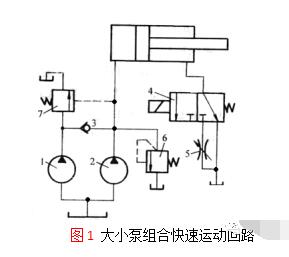 圖1中,泵2為高壓小流量泵,流量按最大工作進給速度選擇,工作壓力由溢流閥6調節。泵1為低壓大流量泵,兩泵流量加在一起按快進時所需的流量來選擇。