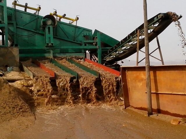 這種溜槽是采用砂泵抽到大溜上面,這種大溜沒有篩分,分離的功能,也沒有洗礦的功能,只能靠人工手持水槍沖洗,礦料從溜槽上流過,通過金氈來回收黃金。還有的是采用勾機上料,把礦料上至大溜上,并且雇傭一些黑人在設備料斗上面坐著進行手持水槍沖洗,然后通過礦料自流,通過礦料自流過金氈回收黃金。這樣的工藝流程回收率不會超過60%。