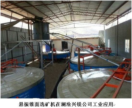 懸振錐面選礦機”是依據拜格諾剪切松散理論和流膜選礦原理研制而成的新型微細粒重選設備。當攪拌均勻的礦漿從分選錐面的給礦器進入盤面初選區時,礦漿流即成扇形鋪展開向周邊流動,在其流動過程中流膜由厚逐漸變薄,流速也隨之逐漸降低。